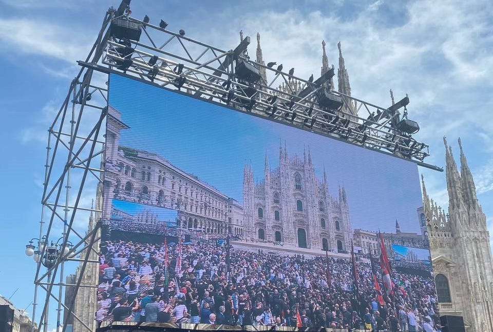 Il centro di Milano è transennato, i tram deviati, ma quando arrivo in Duomo la piazza è ancora semivuota – ci sono solo i fan più accaniti, venuti di corsa da altre città d’Italia e arrivati all’alba, schiacciati contro le transenne con le bandiere di Forza Italia e gli striscioni (“L’Italia è il paese che amo”). Intorno a loro un’organizzazione imponente che racconta di un evento percepito come simbolico: maxischermi ai due lati del Duomo e altri schermi più piccoli collocati in altri punti della piazza trasmetteranno la diretta, seguendo l’arrivo delle autorità e tutto il percorso della salma da Villa San Martino ad Arcore al sagrato, con le corone di fiori e il picchetto d’onore di carabinieri; per ora mostrano una ripresa della piazza stessa, semivuota. Sulla parete posteriore del Duomo, un terzo maxischermo è sintonizzato fin dalla mattina su Canale 5.