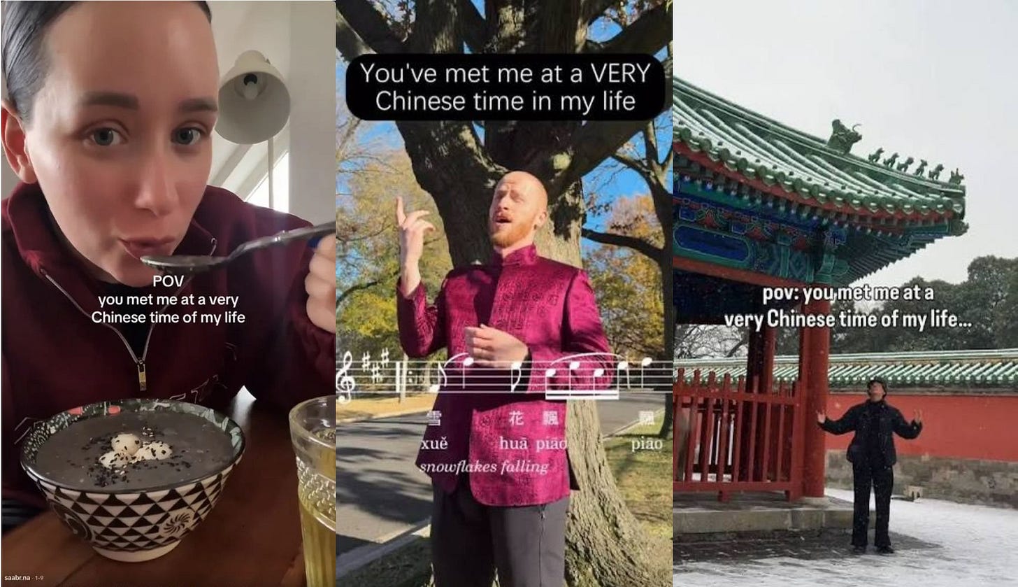 Nel mezzo decennio trascorso dallo scoppio della pandemia, la fascinazione per la Cina non ha fatto che aumentare, attraversando diverse fasi. Una prima fase è quella che, come recita un altro meme a tema, potremmo definire la fase delle “cose incredibili accadono in Cina”: è quella dei reel sui grattacieli illuminati, gli show di droni e i treni veloci che invadono i feed di tutti i social. È una fase che ci ha fatto dire wow, che ha posto le basi perché diventassimo tutti cinesi, ma che oggi sembra essersi un po’ esaurita – e infatti quei contenuti cominciano piano piano a essere sostituiti da quelli che mostrano invece la vera Cina oltre i grattacieli illuminati, gli show di droni e i treni veloci. In questo passaggio di fase, quel fascino iniziale non è andato perso ma sta maturando e radicandosi più in profondità.